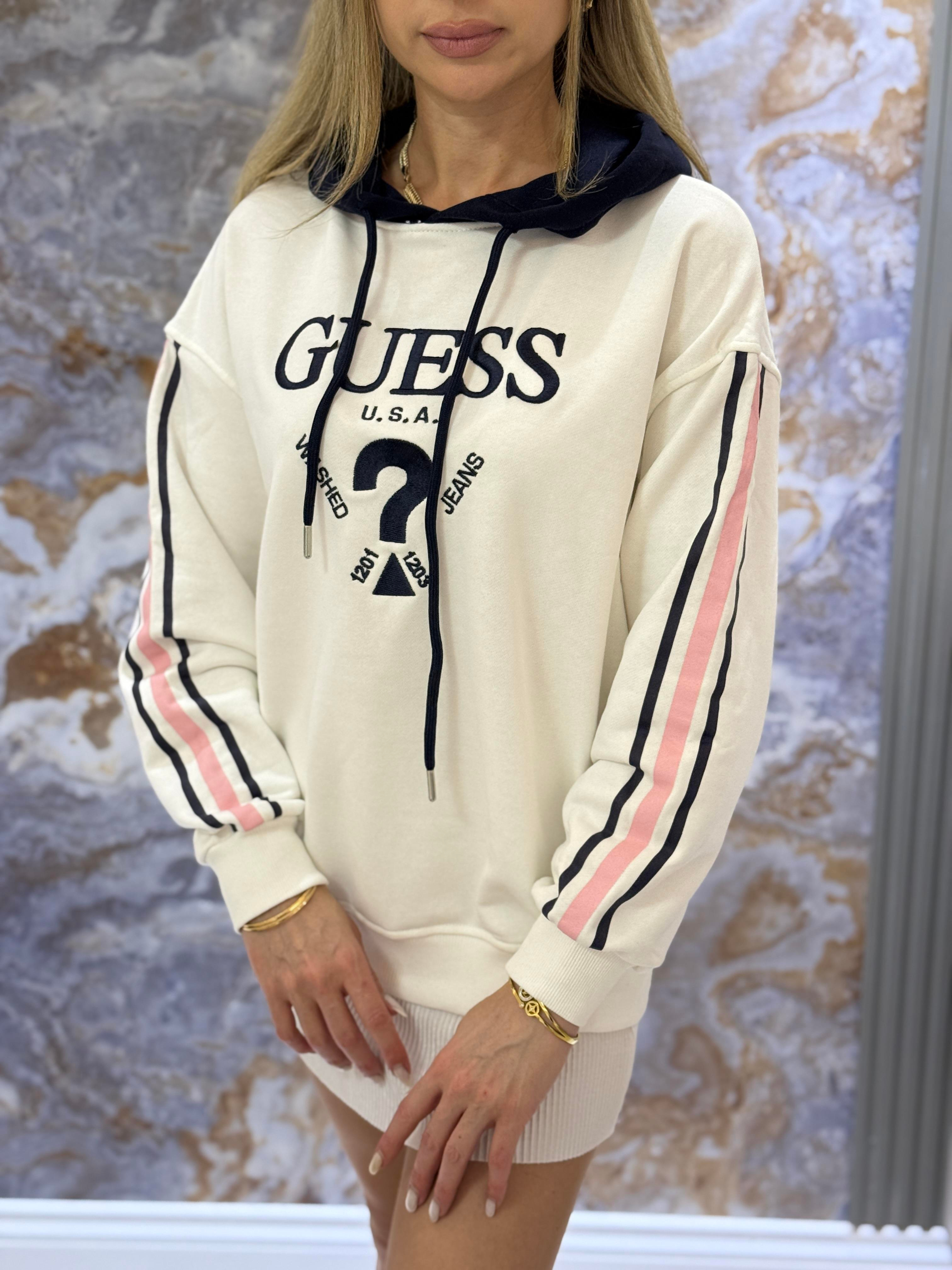 Gu Kapüşonlu Nakış Yazılı Kol Şeretli Beyaz Sweat
